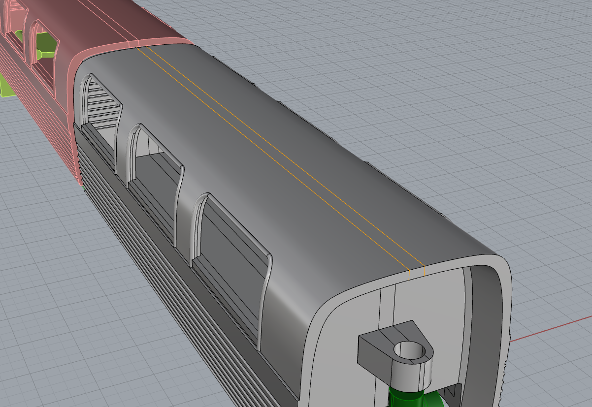 Back to the computer model, I looked for more clearance on the wheel trucks. The skirting is as thin as I can possibly make it and I didn't want to raise the entire train so the trucks can freely spin 360. I ended up just making the entire car wider, not by much, just .050". I figured it was enough to get the model to run properly without making it look odd. The difference between the wider version and the previous version is only noticeable when comparing the two side by side. I essentially split the model right down the middle, move each half from the centerline .025" and then lofted the shells back together. I did have to go back in and fix the pivot points so they weren't oval.